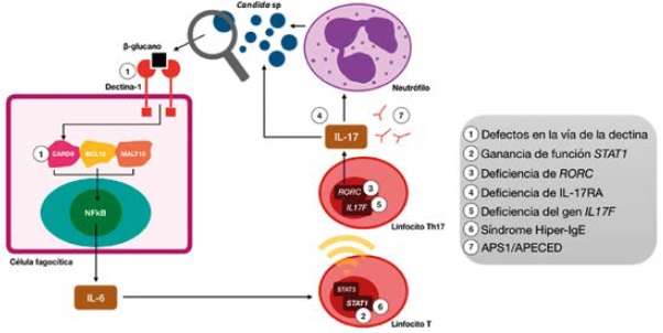 La IL-6 induce la transcripción del STAT3 (factor de transductor de señal y activador de la transcripción 3), el cual se une al promotor de IL-17, llevando a los linfocitos T a diferenciarse hacia su perfil Th17 y así lograr la producción de IL-171. Defectos en cualquiera de los pasos mencionados van a llevar a una disfunción en el control de la infección por el hongo (Tabla 1), (Figura 1), lo que hace importante identificarlos ya que se convierten en dianas terapéuticas en este tipo de pacientes10, los cuales históricamente se han manejado de forma tópica con nistatina o sistémica; con fluconazol como primera línea, y en caso de presentarse resistencia (hasta en el 10 % de los casos)11 con itraconazol, voriconazol o posaconazol8,12.