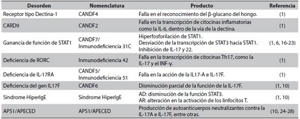 En este dominio pueden presentarse dos alteraciones, una de ellas al existir un defecto en el receptor tipo dectina-1, el cual se va a conocer como candidiasis familiar tipo 4 (CANDF4), y otra respecto al gen que codifica para CARD9, el cual se va a conocer como candidiasis familiar tipo 2 (CANDF2) (Tabla 1). Ambas llevan a la disminución en las células T productoras de IL-17 y por esto a una predisposición a las infecciones, incluso invasivas, por Candida sp; y por otro tipo de feohifomicetos, dermatofitos, Aspergillus sp., Crytococcus neoformans y Pneumocystis jirovecii1.