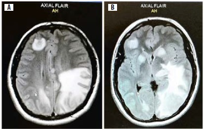 Hombre de 39 años de edad, sin antecedentes personales de importancia, quien consultó por cuadro clínico de dos meses de evolución, constituido por la aparición de fotopsias recurrentes en ambos ojos, sin desencadenante claro. Acompañado, días después, de cefalea hemicraneana izquierda, pulsátil, con irradiación frontal, periocular y occipital ipsilateral, con intensidad moderada a grave, sin más síntomas acompañantes y sin episodios similares previos. Fue evaluado por retinólogo quien al examen oftalmológico encontró en ambos ojos (AO): agudeza visual por carta de Snellen: 20/20, visión cromática 12/12, rejilla de Amsler normal, pupilas normales, motilidad normal, biomicroscopía con segmento anterior normal, tonometría por aplanación Goldmann 16 mmHg y fondo de ojo normal. En vista de tener un examen oftalmológico completamente normal, se solicitó TAC simple y contrastado de órbitas y cerebro de manera prioritaria y con este se realizó la impresión diagnóstica de toxoplasmosis cerebral, por lo que el paciente fue hospitalizado y tratado con trimetoprim/sulfametoxazol IV. Por la alta relación entre toxoplasmosis cerebral y el VIH se le solicitaron ELISA y Western Blot para VIH, ambas positivas. Se realizaron múltiples exámenes de extensión y rastreo para otras infecciones oportunistas: carga viral en 148000 copias, linfocitos T CD4 6 células/mm3, IgG para toxoplasma: mayor de 300 UI/ml (positivo ≥ 12 UI/ml), citomegalovirus: negativo, tuberculina: 2 mm de diámetro, VDRL: no reactivo, TACAR torácico: normal, ecografía abdominal: hígado graso, colonoscopia papiloma en canal anal, hemorroides internas e imagen de resonancia magnética cerebral simple y contrastada (Figura 1 A y B): imágenes axiales en FLAIR donde se observan lesiones numulares (contraste de anillo) derechas en núcleos de la base y región frontal, con áreas de alta intensidad que comprometen la sustancia blanca temporal y occipital izquierda, probablemente por gran edema circundante.