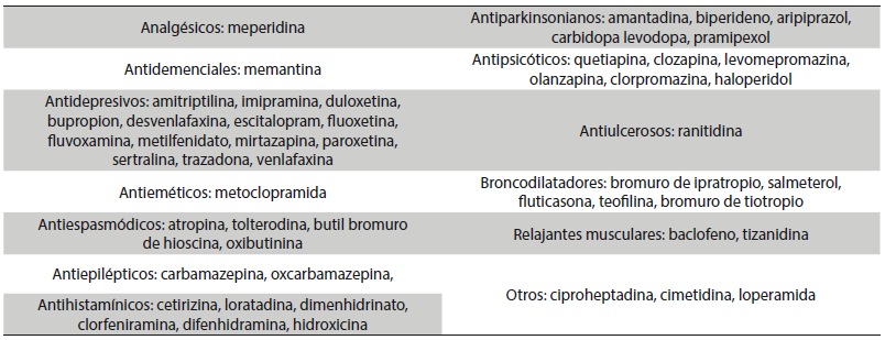 La polifarmacia se define teóricamente como la prescripción de cinco o más medicamentos de uso crónico durante al menos 6 meses 1,2. Pero en la práctica clínica no se ha generado aún un consenso, ya que una persona con múltiples patologías, por ejemplo enfermedad coronaria, diabetes e hipertensión requiere, como mínimo, la utilización de dos medicamentos para controlar cada enfermedad y, bajo este contexto, la seguridad de la terapia se dificulta. Debido a esto se creó el término polifarmacia apropiada, donde se evalúan los medicamentos individualizando cada paciente 1,2. En España, el 11 % de los ancianos que viven en la comunidad y el 30-40 % de los atendidos en los diferentes niveles de atención geriátrica están polimedicados, lo que aumenta el riesgo de eventos adversos a los medicamentos y los ingresos hospitalarios hasta en un 10 %, aproximadamente 3,4. En Colombia, el 10,8 % de la población adulta mayor presenta riesgo de prolongación de QT secundario a polifarmacia 5. Desde el 2013, los medicamentos han ocupado el primer lugar de intoxicación, ya sea por intento de suicidio, automedicacion o ingesta accidental debido a un inadecuado seguimiento en las indicaciones de prescripción 6. El envejecimiento y las enfermedades crónicas traen como consecuencia aclorhidria, retraso en el vaciamiento gástrico, descenso en la cantidad de proteínas, menor capacidad para realizar la fase 1 del metabolismo hepático y la disminución del flujo sanguíneo renal, lo que modifica los procesos farmacocinéticos y farmacodinámicos generando posibles fallas terapéuticas y reacciones adversas 7-9. Se estima que el 58 % de los pacientes tienen prescripciones potencialmente inadecuadas (PPI), siendo estas las responsables del 80 % de las reacciones adversas al generar un alto potencial de daño 3,4. Existen herramientas para optimizar la terapia farmacológica en el adulto mayor; los criterios de Beers involucran PPI e indican los medicamentos que no deben ser formulados. En su última actualización y con evidencia alta, recomiendan evitar la formulación de antihistamínicos de primera generación, anti-parkinsonianos, antipsicóticos, inhibidores de la bomba de protones y depresores del sistema nervioso central, por aumento de los efectos anticolinérgicos y riesgos de caída 10-11. Los criterios STOPP (Screening Tool of Older Person’s Prescriptions) y START (Screening Tool to Alert doctors to Right appropriate, indicated Treatment) describen reacciones adversas asociadas a varios medicamentos PPI, incluyendo analgésicos, vacunas, antibióticos, antiespasmódicos y aquellos con potencial anticolinérgico 12-13. En la práctica clínica se utilizan múltiples medicamentos con potencial efecto anticolinérgico. Del 20 al 50 % de los pacientes mayores tienen prescrito algún fármaco con efecto anticolinérgico, los cuales son empleados en el tratamiento de la incontinencia urinaria, úlcera péptica, colon irritable, depresión, temblor o sedación, por lo cual pueden presentar múltiples reacciones adversas en el sistema nervioso central y periférico, tales como la disminución de la motilidad intestinal, visión borrosa, taquicardia, xerostomía, xerodermia, retención urinaria, estreñimiento, deterioro de la función cognitiva y delirio 14-16. Los grupos farmacológicos de mayor impacto son los antidepresivos tricíclicos, neurolépticos, antihistamínicos y antagonistas de receptores muscarínicos 16) (Tabla 1). La carga anticolinérgica del fármaco se define según su afinidad por el receptor muscarínico, por lo que entre mayor sea la carga, mayor es el riesgo de deterioro cognitivo y confusión.