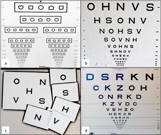 Se usa el cartel de Snellen o ETDRS (Early Treatment Diabetic Retinopathy Study) como en los adultos. El ETDRS es considerado como la prueba estándar para valorar la AV porque reúne los parámetros del comité de visión 37 (Figura 1d).