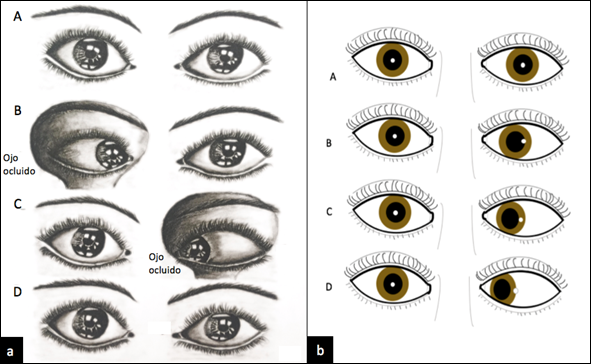 El estrabismo puede ocurrir en cualquier edad y representar alteraciones en órbita, neurológicas, intraoculares o intracraneales. Tanto el reflejo corneal (test de Hirschberg) como el cover test pueden ayudar a diferenciar el estrabismo verdadero del pseudoestrabismo. Si el examen de la motilidad ocular se encuentra alterado o hay inhabilidad para distinguir entre el pseudo y estrabismo verdadero, se debe remitir 2,31. Las principales formas para evaluar si hay estrabismo son: Cover test: se basa en la observación del movimiento de refijación del ojo desviado, cuando el ojo fijador está ocluido. Las tropias se definen como un estrabismo manifiesto, mientras que las forias se definen como una tendencia al desalineamiento cuando se interrumpe la binocularidad del ojo al ocluirlo. El cover test diferencia ambas condiciones. Este se compone del cover uncover test para las tropias y el cover test alternante para las forias. Deben ser realizados en visión lejana (3, 4 o 6 m) y cercana (33-40 cm) (Figura 2a). Si el paciente ya usa corrección (gafas o lentes de contacto), se debe realizar con esta. Si es incapaz de mantener la fijación de la mirada la prueba no será confiable. La precisión del cover test para detectar desviación es mejor en niños mayores de 3 años 6,2,45.