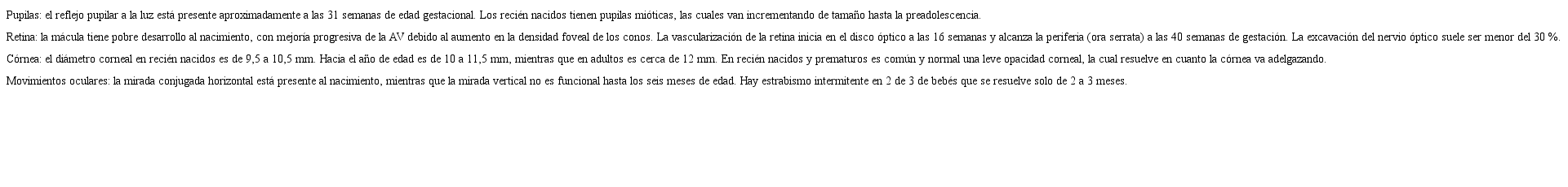 Las características anatómicas oculares y fisiológicas de los niños varían ampliamente respecto a los adultos. Algunas de estas variaciones se ven reflejadas en las pupilas, retina, córnea y en el desarrollo de los movimientos oculares 12