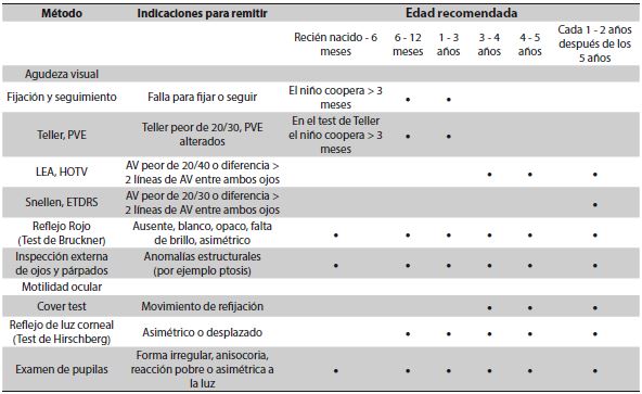Conclusiones: siempre que se detecte en el examen una agudeza visual por debajo de la esperada para la edad del paciente, pobre fijación y/o seguimiento después de los 3 meses, alteración del balance muscular, alteración del reflejo rojo, etc., se debe remitir el niño a un profesional de la salud visual para prevenir pérdida visual permanente.