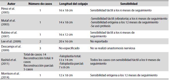 El espectro de posibilidades reconstructivas varía según la necesidad del tejido a reparar (pene, escroto, uretra), la anatomía vascular local disponible y la habilidad del cirujano. Borgoras en 1936, fue el primero en realizar una faloplastia utilizando un colgajo abdominal tubulizado 2. Posteriormente, Gillies y Millard en 1957, publicaron su modificación con el concepto de «tubo dentro de tubo» 2-3, el cual se utiliza hasta la fecha. A partir de estos primeros esfuerzos reconstructivos, se han desarrollado múltiples colgajos tanto regionales como libres, siendo a la fecha el colgajo antebraquial radial libre el más utilizado 4-7. Este colgajo permite la transferencia de tejido poco bultoso, logrando longitudes del neofalo entre 7,5 y 14 cm 1. Además, permite la recuperación táctil y erógena al preservar el nervio cutáneo antebraquial medial y/o lateral, para la posterior anastomosis con el nervio ilioinguinal o nervio dorsal del pene 6. El colgajo ALM fue descrito por primera vez por Song en 1984 4. Fue utilizado como colgajo libre en 2006 para la reconstrucción peneana en 6 pacientes transgénero 1. Sus ventajas incluyen el hecho de ser un colgajo sensible, permite alcanzar longitudes de hasta 10 cm con un diámetro de 3,5 cm, ofrece una forma y consistencia adecuadas, facilita la reconstrucción uretral en el mismo tiempo quirúrgico, cuenta con un pedículo vascular largo, es un tejido de volumen adecuado, con color similar al sitio receptor, deja una cicatriz fácil de ocultar en el sitio donante y presenta estabilidad del volumen en el seguimiento a largo plazo. Como principales desventajas destacan la presencia de tejido graso abundante en personas con IMC mayores de 30 kg/m2, lo cual se traduce en dificultades técnicas durante su realización y la necesidad de hacer uso de la microcirugía tanto para la anastomosis vascular como para la anastomosis del nervio cutáneo femoral al nervio dorsal del pene, cuando se realiza como colgajo libre 8. Aunque al final del seguimiento del caso presentado no se evidenció la presencia de fístulas, se especula que la incidencia de esta complicación y de dehiscencias con el colgajo ALT es mayor con respecto al colgajo antebraquial radial, lo cual posiblemente está en relación con el volumen del colgajo 9. En 2017 7, se compararon los desenlaces del colgajo antebraquial radial con el del colgajo ALM regional, encontrando para este último mayores tasas de pérdidas parciales o totales, mayor incidencia de fístulas uretrales (OR 2,5), complicaciones no uretrales (OR 2,38) y dehiscencia (OR 5,03). En la búsqueda de menores tasas de complicaciones y en la ausencia del recurso microquirúrgico, se ha utilizado el colgajo ALM regional, manteniendo las ventajas descritas previamente del colgajo libre 1,6-8 y, adicionando la disminución del tiempo quirúrgico (3:9). En la Tabla 1, presentamos las principales series de caso descritas en la literatura con los resultados obtenidos y el tamaño de la isla cutánea del colgajo, en donde es evidente que la mayoría son reportes de casos, excepto por la serie de Rashid et al. (2010), en donde se reporta una tasa de falla o necrosis parcial de los colgajos del 0 % (9, 10). Otra de las consideraciones en este tipo de reconstrucción tiene que ver con la transposición del mismo, ya que existen varias técnicas cuando se usa como colgajo regional, entre las cuales está la forma submuscular al recto femoral o los aductores del muslo 5. En nuestra experiencia consideramos que es suficiente la transposición por debajo del sartorio y el recto femoral para no alterar la anatomía de la zona, evitando además la compresión del pedículo vascular y disminuyendo la morbilidad con sección muscular mínima. El diseño utilizado en nuestro caso permite la reconstrucción del glande en tiempo quirúrgico, lo cual presenta ventajas como el menor costo y morbilidad comparado con otras técnicas como la de Norfolk, que requiere de dos tiempos quirúrgicos 1 o la realización de tatuajes para restaurar la apariencia del glande 9. Otra ventaja importante es la ausencia de distorsión de la anatomía del área púbica 5, la similitud del color del área donante con la receptora 6 y el hecho de mantener la inervación de la isla cutánea, lo que teóricamente, es superior al colgajo antebraquial radial en el que por definición existen discrepancias en el tamaño de las fibras nerviosas a la hora de la anastomosis sensitiva 6. Sin embargo, algunos autores han reportado sensibilidad adecuada a pesar de requerirse anastomosis nerviosa y estar sujeto a la recuperación individual de cada paciente 9. En caso de una vasculatura y anatomía pélvica incierta, se prefiere el uso de un colgajo pediculado porque aporta su propio suministro de sangre al falo 9-10.