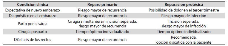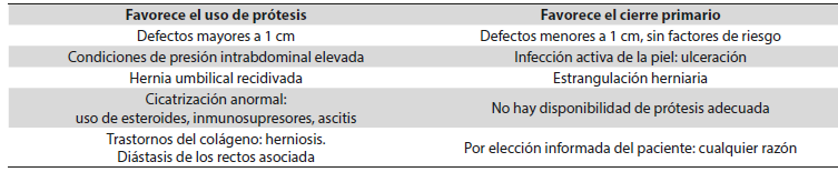 La herniorrafia umbilical concomitantemente con la cesárea es una práctica aceptada, genera satisfacción en las pacientes, debe discutirse en casos sintomáticos y de progresión herniaria, evaluando los pros y contras de la utilización de materiales protésicos en este contexto 35 (Tabla 3).