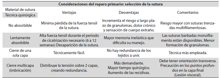Es la técnica utilizada con mayor frecuencia, a pesar de una alta recidiva 13, con diferentes materiales de sutura y formas de efectuar la reparación herniaria 3. Ventajas y desventajas teóricas de las diferentes opciones y materiales en el cierre primario (Tabla 2).