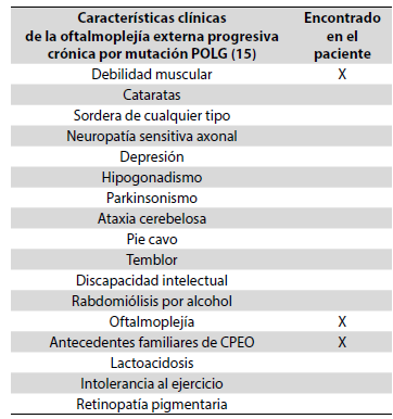 Principalmente, por los hallazgos oculares, el fenotipo del paciente fue específicamente sugestivo de oftalmoplejía externa progresiva crónica (Tabla 1).
