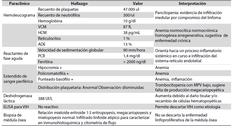 El estudio fue enfocado con base en los siguientes diagnósticos sindromáticos: síndrome adenomegálico generalizado, síndrome constitucional, síndrome febril y síndrome anémico. En la (Tabla 1) se resumen los resultados de los paraclínicos y su interpretación. En los estudios imagenológicos, la radiografía AP y lateral de tórax se evidenció una ocupación mediastinal y otra de la ventana aortopulmonar (Figura 1). En la tomografía axial contrastada del cuello se observaron múltiples adenopatías bilaterales en las cadenas ganglionares II, III y V (Figura 1).