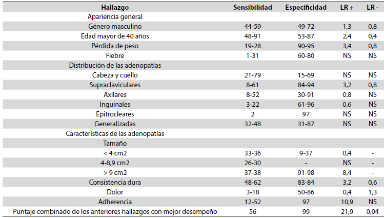 Para complementar la estrategia heurística de diagnóstico, se realizó un ejercicio pedagógico de diagnóstico basado en la mejor evidencia disponible, según las características de las adenopatías. En general los médicos son buenos en el reconocimiento de patrones (heurístico, agrupamiento de signos y síntomas) que permiten llegar a una conclusión diagnóstica; sin embargo, predecir con base en signos y síntomas con probabilidades exactas es difícil, ya que para hacerlo es necesario conocer los estudios de la prueba que evalúen la sensibilidad, especificidad y razones de probabilidad (likelihood ratio, LR), de modo que se obtenga un valor especifico al signo y al síntoma.