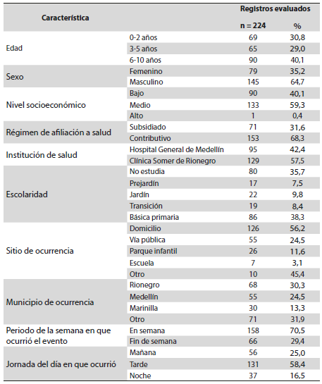 En el periodo de estudio comprendido entre 2010 y 2017 se identificaron en total 224 historias clínicas, de las cuales 95 casos (42,4 %) fueron atendidos en el Hospital General de Medellín y 129 casos (57,5 %) en la Clínica Somer de Rionegro. En los municipios donde más se presentó el evento fue en Rionegro, con 68 registros que representan el 30,3 % de los casos, seguido de Medellín con 55 (24,5 %) y Marinilla con 30 casos (13,3 %). El sexo masculino predominó con 145 casos (64,7 %), hubo una distribución similar en los tres grupos de edad, la media de la edad fue 4,5 años (DE 3,1). Noventa pacientes (40,1 %) pertenecían al nivel socioeconómico bajo y 133 (59,3 %) al nivel socioeconómico medio; el sitio donde ocurrió el mayor número de traumas fue en el domicilio con 126 casos que representan el 56,3 % (Tabla 1).