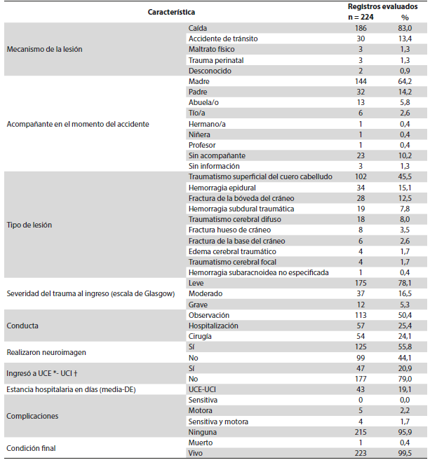 Resultados: se encontraron 224 pacientes con traumatismo craneoencefálico, el 64,7 % de los casos fueron de sexo masculino, la edad promedio fue de 4,5 años. El trauma ocurrió con mayor frecuencia en el domicilio del paciente entre los días de la semana en las horas de la tarde. La causa principal del trauma fue caída (75 %), seguido por accidentes de tránsito (13,3 %). La gravedad del traumatismo se midió con la escala de coma de Glasgow, el 78 % fue leve, hubo un caso fatal y 7 (3 %) tuvieron complicaciones motoras durante la hospitalización.