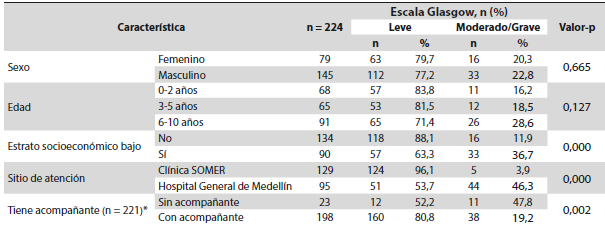 En el análisis bivariado se encontró una diferencia significativa entre el TCE moderado/grave y el leve en cuanto a nivel socioeconómico bajo (valor p = 0,000), la atención en el Hospital General de Medellín (valor p = 0,000) y no tener acompañante (valor p = 0,002). No se encontró diferencia con las variables sexo y edad (Tabla 3).