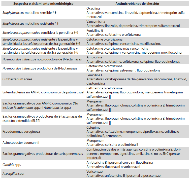La terapia antimicrobiana empírica se basa en la administración de agentes que puedan penetrar el SNC y lograr adecuadas concentraciones en LCR, como la vancomicina y un betalactámico con actividad antipseudomonas como el cefepime, ceftazidima o meropenem, el cual debe ser elegido de acuerdo al perfil de sensibilidad del microorganismo y a las características propias del paciente 104.
