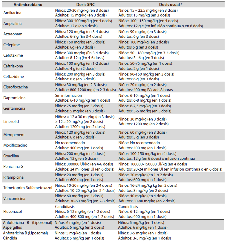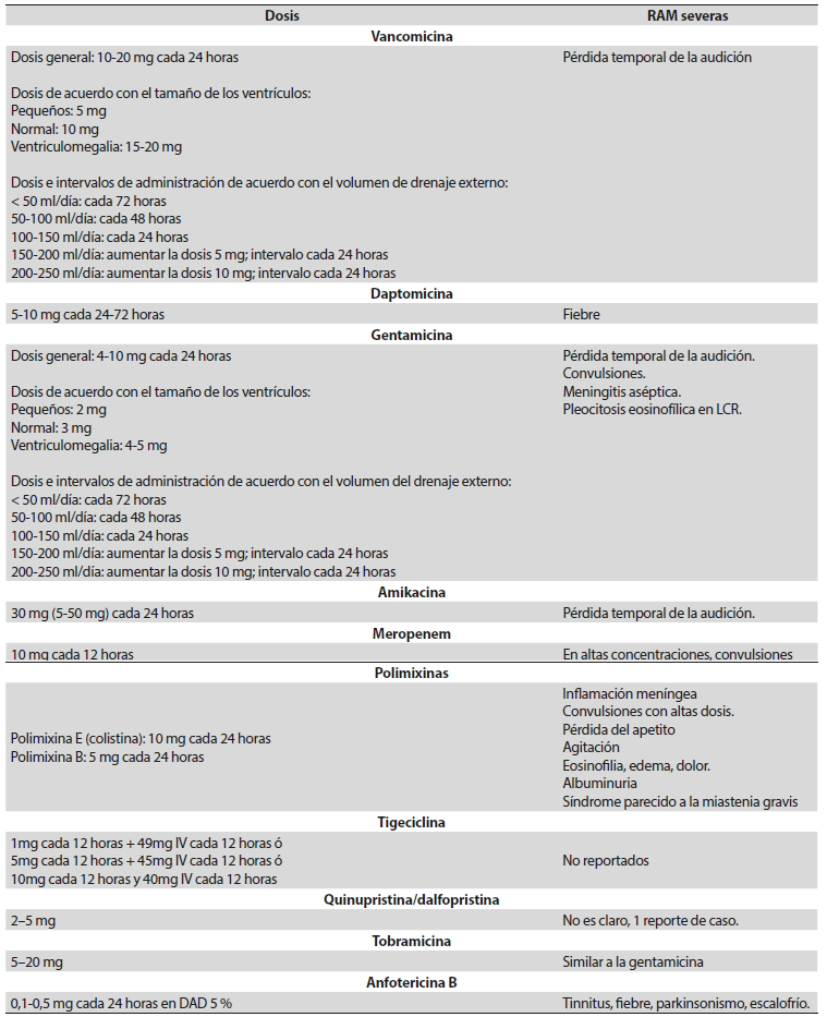 Por otro lado, cuando se decide adoptar esta terapia, debe hacerse a través de dispositivos cerrados, bajo estrictas medidas de asepsia y antisepsia y con posterior clampeo de la sonda por 15-60 minutos para equilibrar las concentraciones del antimicrobiano en el LCR 128-135. De igual manera, para la monitorización de la efectividad de la terapia, se usan elementos clínicos y de laboratorio para el seguimiento del paciente, así como medidas farmacocinéticas tales como la toma de niveles del antibiótico en LCR, las cuales, bajo división por la CIM del microorganismo aislado, debe arrojar constantes entre 10 y 20 128-135. Con respecto a la elección, las dosis y los intervalos de la administración de antimicrobianos, las decisiones deben tener en consideración el microorganismo aislado y su patrón de resistencia, la neurotoxicidad del agente y la salida diaria de LCR por el drenaje externo 109,128-135-148 (Tabla 3 y Tabla 4).