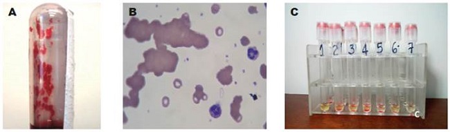 En el laboratorio la aglutinación puede detectarse inicialmente a través del hemoleucograma y verificarse en el extendido de sangre periférica 14. Este fenómeno de aglutinación produce cambios en los contadores automatizados, llevando a un falso incremento en el volumen corpuscular medio de los eritrocitos (VCM) (en ocasiones superior a 140 fL), una falsa reducción en el conteo de glóbulos rojos y una alteración en la relación hemoglobina-hematocrito 15. En ocasiones, dicho fenómeno puede evidenciarse macroscópicamente. La sangre se observa con un aspecto de leche cortada (Figura 1A); pero, otras veces, es indispensable hacer la observación microscópica (Figura 1B). Otros hallazgos de laboratorio que se puede encontrar es la hemólisis extravascular con hiperbilirrubinemia indirecta y elevación de la deshidrogenasa láctica (LDH); la prueba de antiglobulina directa (DAT, prueba de Coombs) es usualmente positiva para IgM (o IgG) y C3d libre a títulos bajos 4. El diagnóstico de EAF se confirma con pruebas serológicas de crioaglutininas para obtener una titulación de los anticuerpos (Figura 1C).