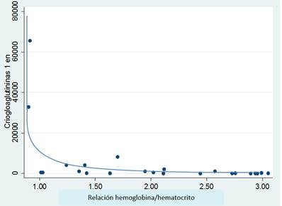 En la correlación de variables, no hubo diferencias en los laboratorios entre los casos con EAF primaria y secundaria. Tampoco entre el título de IgM y hemoglobina o, la relación entre hemoglobina y hematocrito (Rho -0,227 y -0,038) (Tabla 3). Parece existir una relación inversa entre los títulos de crioaglutininas y la relación hemoglobina/hematocrito alterada (Rho -0,683) (Figura 2).
