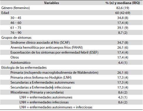 Materials and Methods: Retrospectively, we analyzed clinical data of patients from Hospital Universitario San Vicente Fundación with positive results for cold agglutinin assays made in the hematology lab from Universidad de Antioquia. We consider patients with titers ≥ 1:64 or Coombs test positive for cold antibodies.