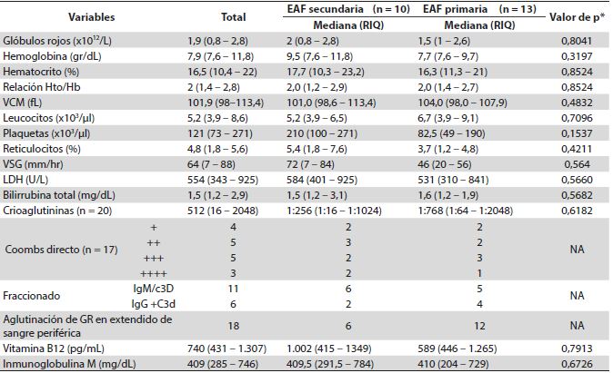 Las variables clínicas, demográficas y de laboratorio con distribución normal se describen con la mediana y el rango intercuartil (RIQ). El análisis de las diferencias entre las variables del laboratorio del grupo de EAF primarias y secundarias se realizó con la prueba, no paramétrica, de la U de Mann-Whitney. De manera exploratoria, las correlaciones entre variables analíticas como la hemoglobina o la relación entre esta y el hematocrito con los títulos de IgM y los de las crioaglutininas se realizaron con la prueba, no paramétrica, del coeficiente de correlación de Spearman.