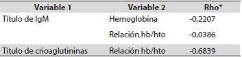 Finalmente, tanto en los casos de EAF primaria como secundaria no observamos una correlación positiva entre los valores de IgM y hemoglobina o la relación hemoglobina/hematocrito. Pero de manera consistente, los títulos de crioaglutininas muestran una correlación inversa con la relación hemoglobina/hematocrito (Rho -0,683).
