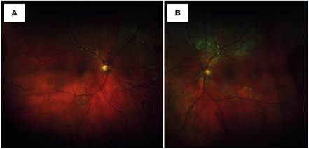 En el examen oftalmológico se encontró una agudeza visual mejor corregida (AVMC) en su ojo derecho (OD) de 20/30 y en su izquierdo (OI) de 20/200. Ambos ojos sin hiperemia conjuntival y con presencia de signos inflamatorios en la cámara anterior (celularidad 0,5+, flare 1+) y en la cavidad vítrea (opacidad vítrea 1+) de su OI. En la prueba de fondo del ojo presentó en su OD lesiones cicatrizadas del epitelio pigmentario de la retina en la mácula y en región nasal al nervio óptico. En su OI se observó la pérdida del brillo foveal por un posible edema macular, lesiones coroideas blanquecinas de 0,7 DD en las arcadas temporales de predominio superior, algunas de ellas confluentes (Figura 1).