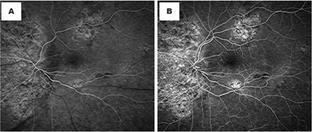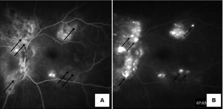 Se realizó una angiografía con fluoresceína (AGF) que evidenció lesiones retinocoroideas cicatrizadas e inactivas en el OD e imágenes en retina y coroides sugestivas de actividad inflamatoria en su OI, con hiperfluorescencia en las fases tardías en las arcadas vasculares temporales y nasal asociadas con áreas de vasculitis retinal periférica (Figura 2).