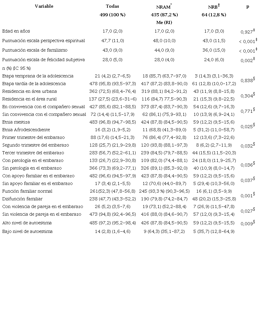 La Tabla 1 presenta las características sociodemográficas de las participantes y su distribución entre el NRAM o NRB. La mediana de edad fue de 17 años, la mitad de las participantes pertenecían a familias disfuncionales según el APGAR familiar; el 3 % consideró no tener apoyo familiar para el embarazo o tenían baja autoestima, el 5 % había sido víctima de violencia de pareja dentro del embarazo. Entre las gestantes adolescentes afrodescendientes hubo una mayor frecuencia del NRB en comparación con las mestizas, 31,2 % vs. 12,2 %, respectivamente. A su vez, las jóvenes con un NRB tuvieron una menor puntuación en perspectiva espiritual, familismo y felicidad que el que tenían las gestantes con un NRAM (p < 0,05). La carencia del apoyo y la disfunción familiar, la violencia de pareja, presencia de patología en el embarazo y baja autoestima, fueron más frecuentes entre las adolescentes con un NRB (p < 0,05). No se observaron diferencias en la edad, etapa de adolescencia, zona de residencia, estrato socioeconómico, escolaridad, ocupación laboral, asistencia a la iglesia, condición de religiosidad, semanas de gestación, trimestre de inicio del control prenatal, número de ecografías, embarazo de alto riesgo, personas que convivían en casa, consumo de cigarrillo, alcohol o psicoactivos, apoyo de amigos, acompañamiento de entidades gubernamentales, escolaridad, convivencia, apoyo y edad del compañero sexual (p > 0,05). Tuvieron un NRB 3 (14,2 %) de las 21 gestantes que estaban en la adolescencia temprana y, 61 (12,7 %) de las 478 que estaban en la adolescencia tardía. X2 = 0,041 (Mantel-Haenszel), p = 0,8.