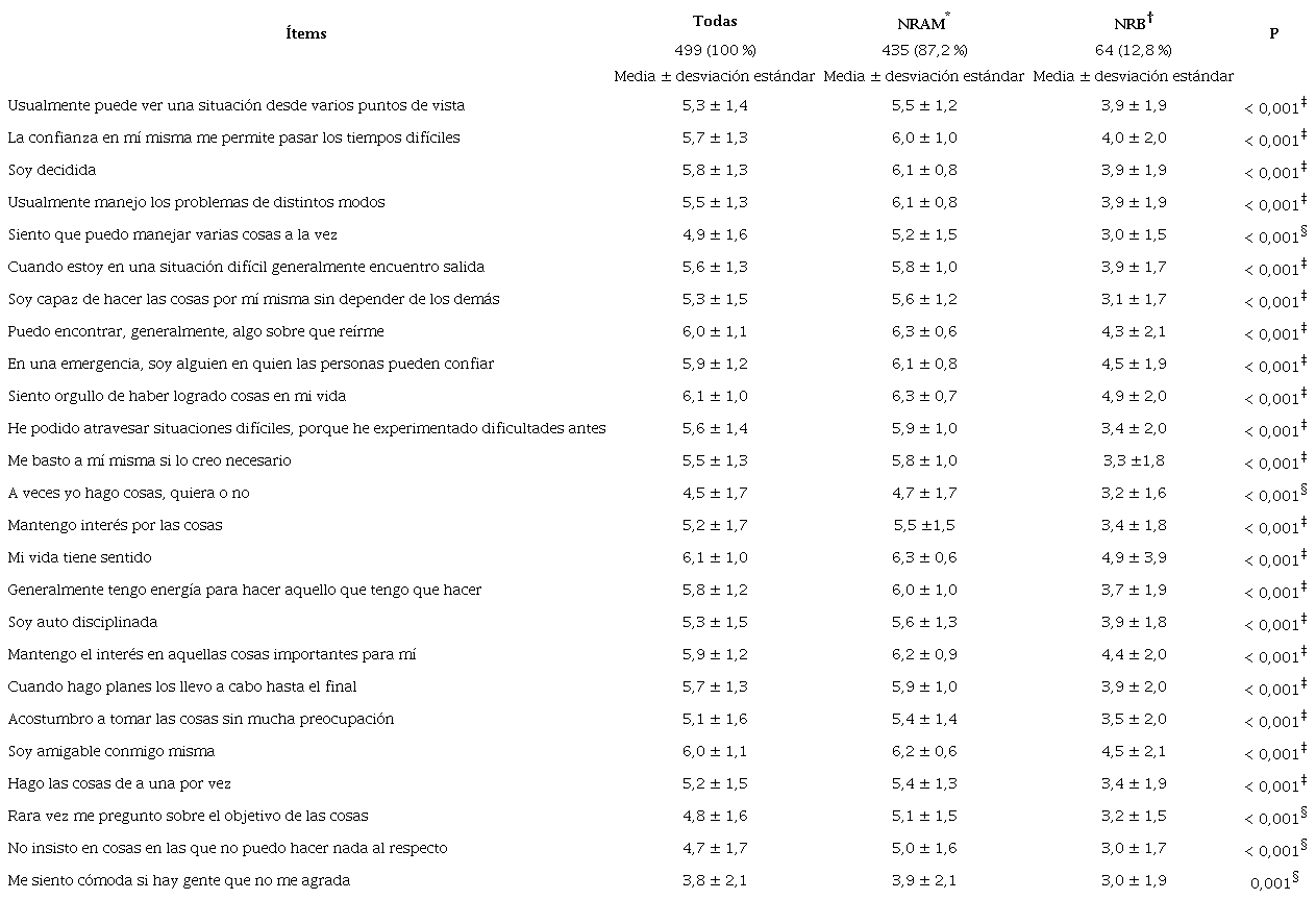 Se encontraron los siguientes niveles de resiliencia: alto 138 (27,7 %) (IC 95 %: 23,8-31,8), moderado 297 (59,5 %) (IC 95 %: 55,1-63,8) y bajo 64 (12,8 %) (IC 95 %: 10,1-16,2). Se identificó el alfa de Cronbach: 0,747. La Tabla 2 presenta la media y desviación estándar de cada uno de los ítems de la escala. Aquellos que tuvieron una mayor puntuación: “Siento orgullo de haber logrado cosas en mi vida” y “Mi vida tiene sentido”; menor puntuación: “A veces yo hago cosas quiera o no preguntó sobre el objetivo de las cosas” y “No insisto en cosas en las que no puedo hacer nada al respecto”. Las jóvenes con un NRAM tuvieron una mejor puntuación en todos los ítems que las que tuvieron un NRB. La puntuación de la escala para todos los participantes: 136,9 ± 20,7; las que tuvieron un NRAM 142,8 ± 11,1 y, las del grupo NRB: 96,4 ± 25,4 (p < 0,001).
