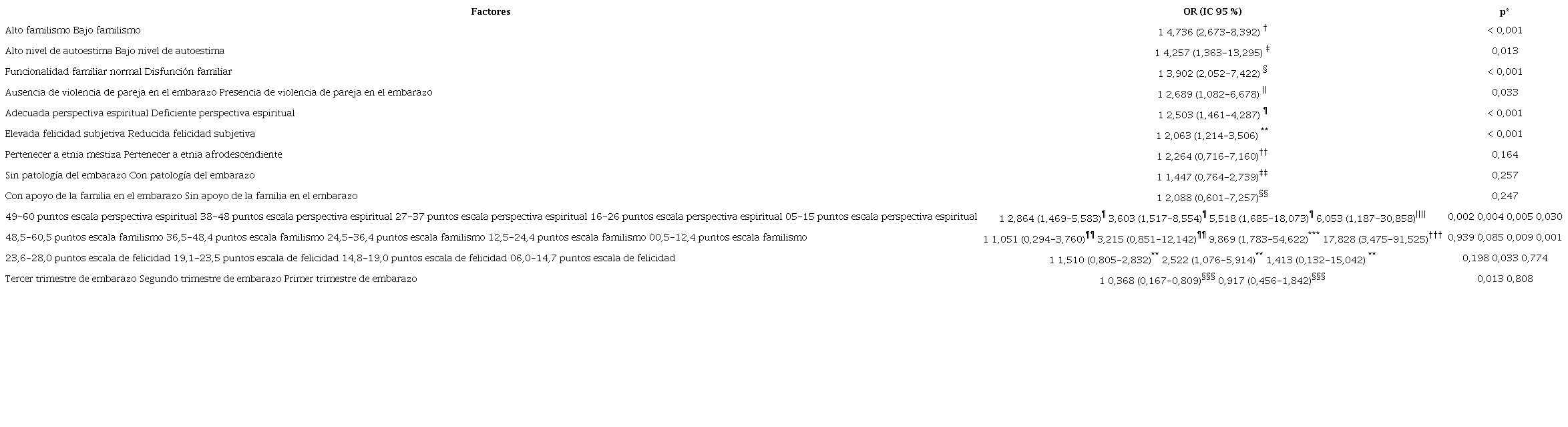 Se realizó la regresión logística ajustada, resultados en la Tabla 3. Seis factores psicosociales se asociaron con un NRB: bajo familismo, bajo nivel de autoestima, disfunción familiar, violencia de pareja en el embarazo, deficiente perspectiva espiritual y reducida felicidad subjetiva (p < 0,05). Por cada punto que aumentaba la escala de perspectiva espiritual, familismo y felicidad, se reducía la puntuación de la escala de resiliencia en 0,049; 0,079 y 0,081, respectivamente. A medida que se disminuían las puntuaciones en cada una de esas escalas había una mayor presencia del NRB. El segundo trimestre del embarazo se asoció con un menor NRB, en referencia al tercer trimestre.