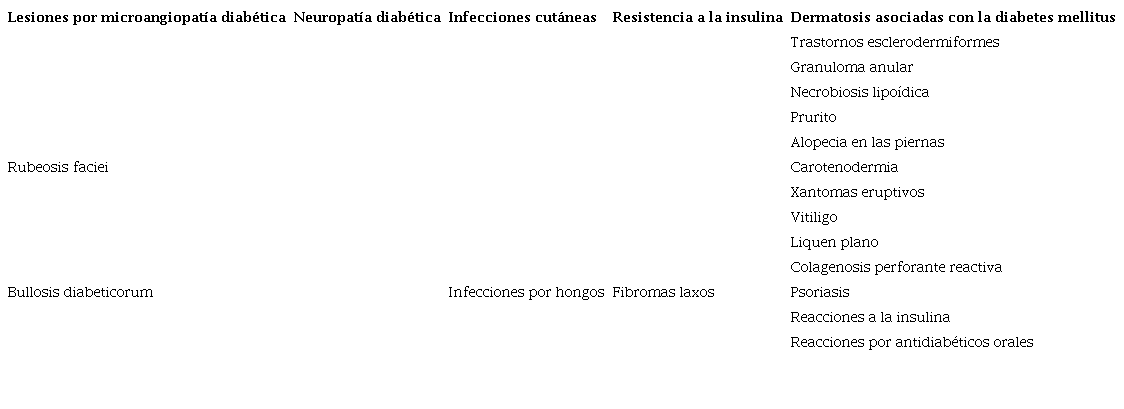 En uno de los textos clásicos de dermatología se clasificaron inicialmente las manifestaciones cutáneas de la diabetes según su asociación con alteraciones metabólicas, vasculares, neurológicas o inmunológicas, además de aquellas con patogenia desconocida (15). Posteriormente, otros autores han incluido las infecciones cutáneas que afectan al paciente diabético y las complicaciones de la terapia antidiabética (15,16). A continuación, se revisan las principales manifestaciones cutáneas de la diabetes a partir de su etiología (Tabla 1).