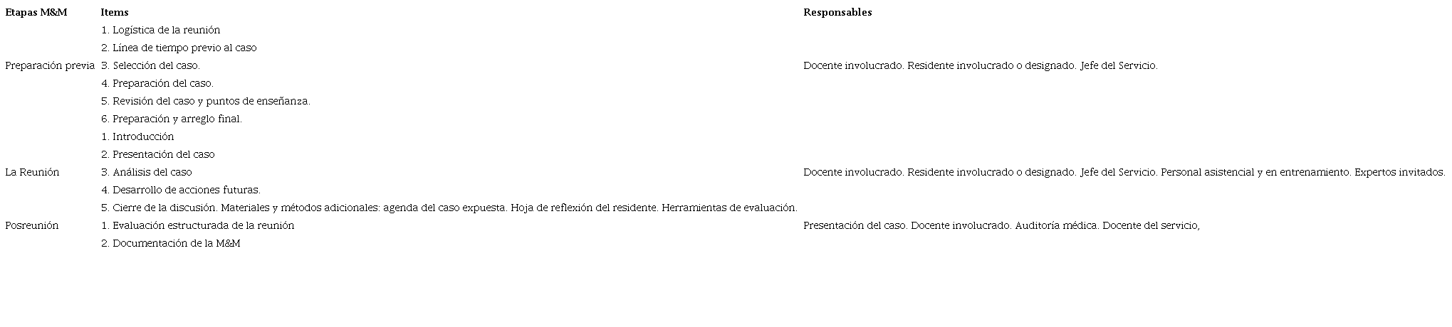 Un formato de las M&M con realización de fases secuenciales, producto de un abordaje integral del tema e implementado con éxito en la Universidad de Colorado (EE. UU.), se expone en la Tabla 2 (15). Su adaptación en un contexto local es factible y representa una oportunidad para responder a los cuestionamientos técnicos ya enunciados.