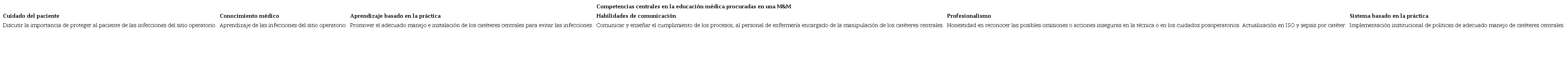 Adicionalmente, en su implementación se debe evaluar y promover el cumplimiento de las seis competencias centrales, esperadas en la formación de los estudiantes en los diferentes programas educativos (Core Competences), con el fin de favorecer su desarrollo en los futuros profesionales (33-34). Esto se ejemplifica en un caso clínico de un evento adverso, como la infección del sitio operatorio (ISO) tras la instalación de un catéter central: se espera la elaboración y desarrollo de conceptos como la importancia de la asepsia y antisepsia, la técnica quirúrgica, los cuidados posteriores al procedimiento y los conocimientos de una ISO. Esta M&M debe abordar, además, puntos clave de la seguridad del paciente que impacten en la calidad institucional y, de igual manera, procurar el reforzamiento proactivo de la necesidad del trabajo bien hecho, fortaleciendo las oportunidades de éxito (22) (Tabla 3).