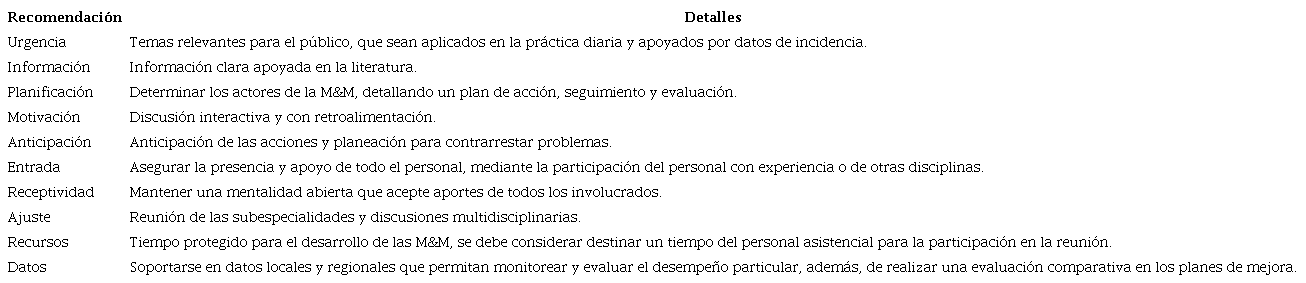 Las reuniones o conferencias de morbilidad y mortalidad (M&M), una práctica común en todo el mundo, buscan evaluar los eventos adversos y las complicaciones relacionadas con la atención médica, desde una perspectiva académica y considerando un mejoramiento en la calidad de la atención hospitalaria. Sin embargo, en nuestro país, su ejecución es un desafío metodológico debido a la dificultad para su conceptualización, implementación, evaluación de su efectividad y utilidad como herramienta educativa; al estar carente de una estructura formalizada que considere estos temas.