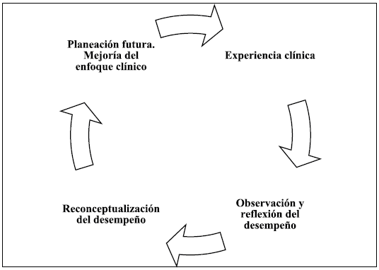Una teoría de aprendizaje experiencial. Establece un ciclo en el cual, inicialmente, se involucra una actividad profesional. Luego se reflexiona y critica su desempeño, con una utilización posterior de esa evaluación para construir un mejor abordaje para futuros casos y una implementación sistemática del mismo cuando sea requerido, desarrollando así una maestría en la práctica profesional (19-20). Se aprende de una experiencia o desenlace negativo, generalmente, producto de un error u omisión propia o del otro que impacta en el paciente. (Figura 1).