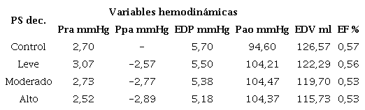 Seguidamente, se realiza el análisis relacionando la inervación parasimpática con el registro de las variables hemodinámicas estudiadas, simulando así, la hipótesis B. En la Tabla 4 se muestran estos resultados (disminución de la actividad parasimpática [PS dec.]).