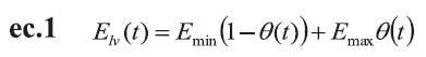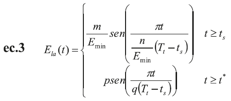 Emin y Emax son los valores mínimos diastólicos y máximos sistólicos de la función de elastancia ventricular, respectivamente. Tt , es el período de tiempo total del ciclo cardíaco y, ts , es el período de tiempo de la sístole, a y b son constantes que definen la amplitud de la onda.