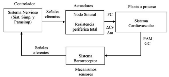 La elevación de la PA distiende los barorreceptores y les hace transmitir señales al interior del sistema nervioso central, desde donde vuelven señales de retroacción a la circulación para reducir la presión hasta su valor normal, realizando igualmente el proceso inverso. Para el mecanismo de control el modelo utiliza las ecuaciones matemáticas de los controladores proporcional, integral y derivativo (PID), que funcionan bajo el principio de realimentación de lazo cerrado adaptándose al principal mecanismo homeostático fisiológico.