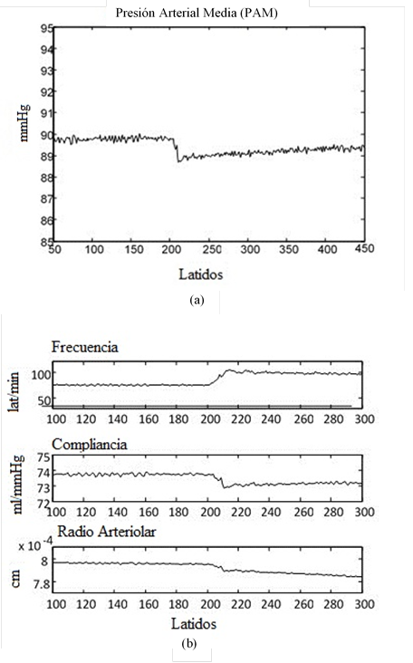 La Figura 2 muestra cómo a partir de las variaciones de la frecuencia cardíaca y en la resistencia periférica ejecutadas por las acciones del control del SNS y el SNP, el modelo es capaz de simular el control sobre la presión arterial.