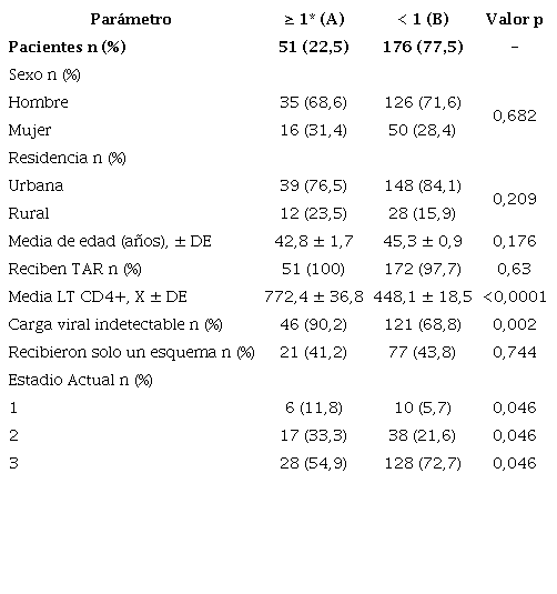 Resultados: el estudio se compuso de la siguiente forma, 71 % hombres y 29 % mujeres. El 22,5 % pertenecía al grupo A y el 77,5 % al B. La media de la edad fue 42‚8 años en el grupo A y 45 en el B (p = 0‚176). El 100 % de los individuos en el grupo A recibían tratamiento y, 97‚7 % en el B. La media de LT CD4+ fue de 772‚4 para el grupo A y, 448‚1 en el B (p = 0‚00001). En el grupo A el 90‚2 % tenían carga viral indetectable‚ en contraste con el 68‚8 % del B (p = 0‚002). El 41‚2 % en el grupo A tuvieron un solo esquema‚ en relación con el 43,8 % del B (p = 0‚744).