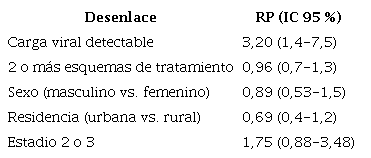 De acuerdo a la razón de prevalencia (RP) los pacientes con una relación CD4:CD8 < 1, tienen una probabilidad 3,2 veces más de presentar una carga viral detectable (falla viral --FV) comparado con los pacientes con una relación ≥ 1; siendo estadísticamente significativa. Mientras que la RP de los individuos que recibieron 2 o más esquemas, comparados con los que solo tuvieron uno de ellos, fue de 0,96 (intervalo de confianza: IC 95 % 0,7-1,3).