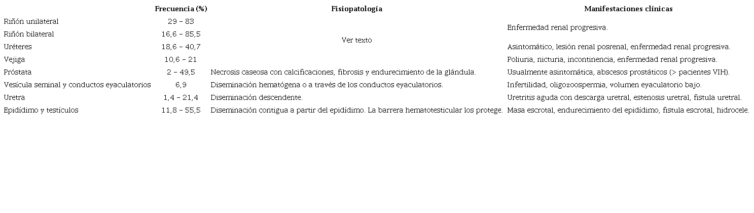 La tuberculosis urogenital es una de las presentaciones más comunes de la tuberculosis extrapulmonar. Su compromiso secuencial y descendente, con afectación importante de los uréteres y la vejiga, usualmente hace que el paciente consulte por cierto grado de insuficiencia renal y síntomas relacionados con el almacenamiento vesical. Debido a que la baciluria no es persistente, frecuentemente estos pacientes son diagnosticados con infecciones urinarias recurrentes.