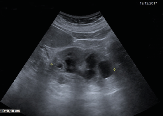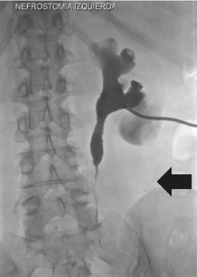 Mujer de 71 años con antecedente de infecciones urinarias recurrentes sin microorganismos aislados y con poca mejoría de acuerdo con los esquemas antibióticos recibidos. Nefrectomía derecha en el año 2016 por hidronefrosis de etiología desconocida; además, enfermedad renal crónica en estadio terminal con necesidad de terapia de reemplazo renal desde el mes de febrero del 2017. En diciembre del año 2016 ingresó al Hospital Pablo Tobón Uribe por presentar hematuria macroscópica, dolor hipogástrico y fiebre. En la revisión por sistemas la paciente refería tener síntomas irritativos urinarios crónicos con dos años de evolución, por lo que ya le habían realizados múltiples estudios, sin encontrar la causa. En el examen físico se observó una paciente caquéctica, pálida, febril, hemodinámicamente estable, con hipersensibilidad al palpar el hipogastrio. Se realizaron estudios complementarios, entre ellos: citoquímico de orina con proteinuria de 150mg/dL, hematuria de 11-20 por campo de alto poder (CAP), leucocituria > 50 por CAP, con gram de orina negativo para bacterias, urocultivo y hemocultivos negativos, Elisa para VIH negativo, niveles de 25-OH-vitamina D muy bajos (7 ng/mL); ecografía renal con hidronefrosis grado 5 izquierda con signos de pionefrosis (por lo cual, requirió nefrostomía [Figura 1]); pielografía anterógrada izquierda que mostró hidronefrosis severa con deformidad de los cálices menores y estenosis arrosariada del uréter proximal (Figura 2); biopsia vesical donde se observaron múltiples granulomas sin evidenciar micobacterias.