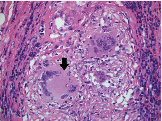 Se evaluó nuevamente la histología del riñón derecho nefrectomizado en el año 2016. Se encontraron hallazgos compatibles con pielonefritis crónica granulomatosa (Figura 3). Por los datos clínicos reportados y los hallazgos en la biopsia renal y vesical se sospechó de tuberculosis genitourinaria. Esta se confirmó median-te la detección en la orina de ADN de Mycobacterium tuberculosis por medio del método GeneXpert® MTB/RIF y, posteriormente, el cultivo para micobacterias en la orina fue positivo (fecha de toma: 26/12/2017, fecha de detección: 12/01/2018). Se realizó una búsqueda activa de infección pulmonar que se descartó por medio de fibrobroncoscopia y lavado broncoalveolar. Se inició tratamiento con esquema tetraconjugado (isoniazida, rifampicina, pirazinamida, etambutol) y se decidió llevar a nefrectomía izquierda.