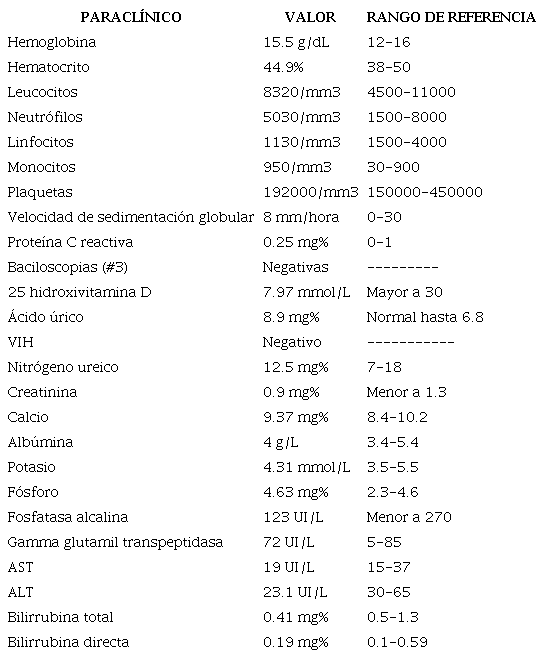 Hombre de 27 años, natural y residente de Medellín (Colombia), conductor de profesión. Como antecedentes personales padeció leucemia linfoide aguda a los tres años, en remisión sostenida desde entonces. Seis meses antes del cuadro clínico actual el paciente se realizó dos tatuajes: uno en el brazo derecho y el otro en el antebrazo izquierdo. Ingresó al servicio de urgencias en agosto del 2016 por un cuadro clínico de seis meses de evolución, este consistente en malestar general, fiebre subjetiva, escalofríos, mialgias, artralgias, tos con expectoración hemoptoica y edema en los miembros inferiores. En el examen físico estaba en aceptables condiciones generales, sin hallazgos importantes, salvo unos estertores crepitantes en ambos campos pulmonares de predominio basal. En los paraclínicos de ingreso se evidenció un hemograma sin alteraciones significativas, con reactantes de fase aguda función hepática y renal normales (Tabla 1).