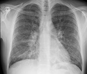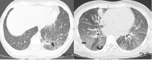Por la presencia de los síntomas pulmonares se ordenó una radiografía del tórax. Esta evidenció el compromiso intersticial pulmonar y perihiliar (Figura 1). Posteriormente se hizo una tomografía del tórax de alta resolución, que mostró un patrón micronodular perilinfático (Figura 2). Adicionalmente, se solicitaron pruebas serológicas para VIH, baciloscopias seriadas y lavado broncoalveolar, las cuales fueron negativas; además de una prueba de tuberculina de 0 mm.