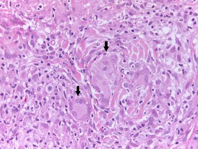 La biopsia de la piel mostró abundantes granulomas conformados por histiocitos epitelioides, algunos de ellos con tendencia a coalescer. Adicionalmente, se observaba una reacción inflamatoria compuesta por células mononucleares y gigantes multinucleadas tipo Langhans. No se observó necrosis y las tinciones con ZN y plata metenamina fueron negativas (Figura 4).