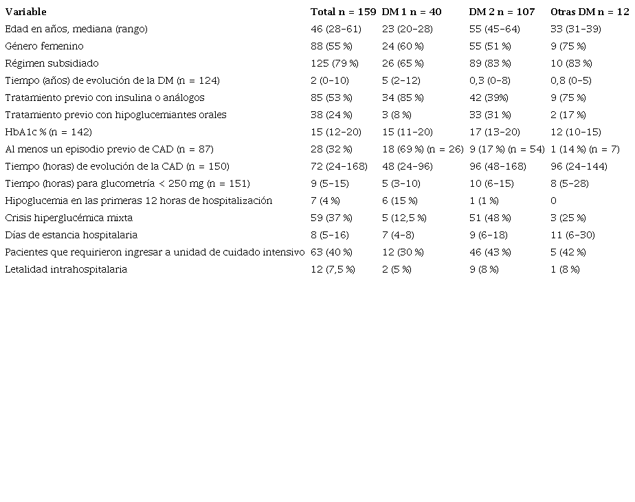 La Tabla 1 presenta las principales características demográficas y clínicas de los individuos con CAD, estratificados según el tipo de DM. Hubo 159 adultos con CAD (con igual número de episodios) en el período de tiempo señalado. La mediana de edad fue de 46 años (rango: 28-61). 40 pacientes (25 %) tuvieron un diagnóstico de DM tipo 1, 107 (67 %), del tipo 2 y 12 (8 %) de otro tipo de DM (en esta categoría estaban personas con sospecha de diabetes autoinmune latente del adulto, diabetes secundaria a pancreatitis crónica o trauma pancreático). Al momento del diagnóstico de la CAD el 53 % de los pacientes estaba utilizando insulina humana o análogos de insulina, el 24 % hipoglucemiantes orales.