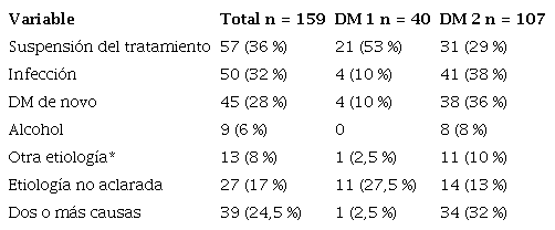 La Tabla 2 muestra los factores precipitantes de la CAD según el tipo de DM. La causa más común de CAD fue la suspensión del tratamiento hipoglucemiante (36 %), seguido de infección (32 %) y diabetes de novo (28 %). En alrededor del 25 % de los pacientes se documentaron dos o más causas de la CAD.