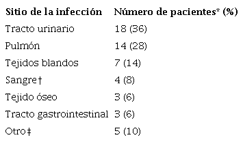 La infección como factor predisponente de la CAD fue casi 4 veces más frecuente en el grupo de DM tipo 2 en relación con el de DM tipo 1. De los 50 casos con diagnóstico de infección, 40 (80 %) tuvieron aislamiento microbiológico, en 5 (10 %) se consideró infección por clínica e imagen compatible y, en los 5 restantes (10 %) se hizo el diagnóstico por prescripción de tratamiento antibiótico efectivo según el proceso infeccioso sospechado. Los focos más frecuentes fueron urinario, pulmonar y tejidos blandos (Tabla 3). Solo el 30 % de los pacientes con infección tuvo fiebre objetiva.