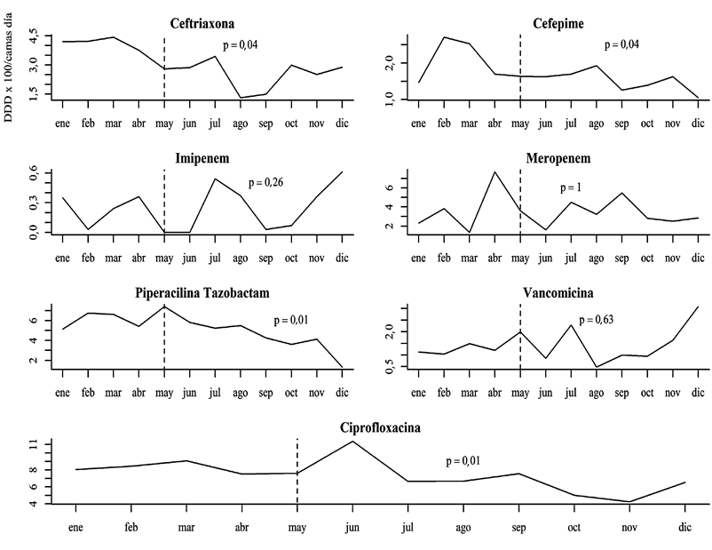 Luego del inicio de la intervención en mayo, se evidenció una reducción importante en el consumo global de piperacilina tazobactam, ceftriaxona y cefepime, sin evidenciar un incremento del consumo de ciprofloxacina. No se registró una disminución significativa en la prescripción del resto de antibióticos a través de los meses (Figura 1).